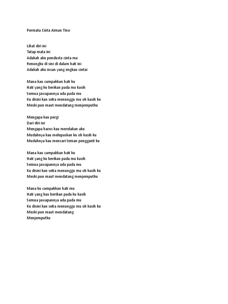 Lirik Lagu Permata Cinta Aiman Tino Lihat diri ini Tatap mata ini Adakah aku pendusta cinta mu Renungku di sini di dalam hati ini Adakah aku insan yang engkau cint Kamu bisa berlangganan atau membeli lagu ini lewat media digital resmi seperti iTunes Spotify dan media pembelian resmi online musik lainnya atau kamu bisa. Semua jawapannya ada pada mu. Nah itulah tadi Lirik Lagu Permata Cinta Aiman Tino yang bisa kami sampaikan kepada.